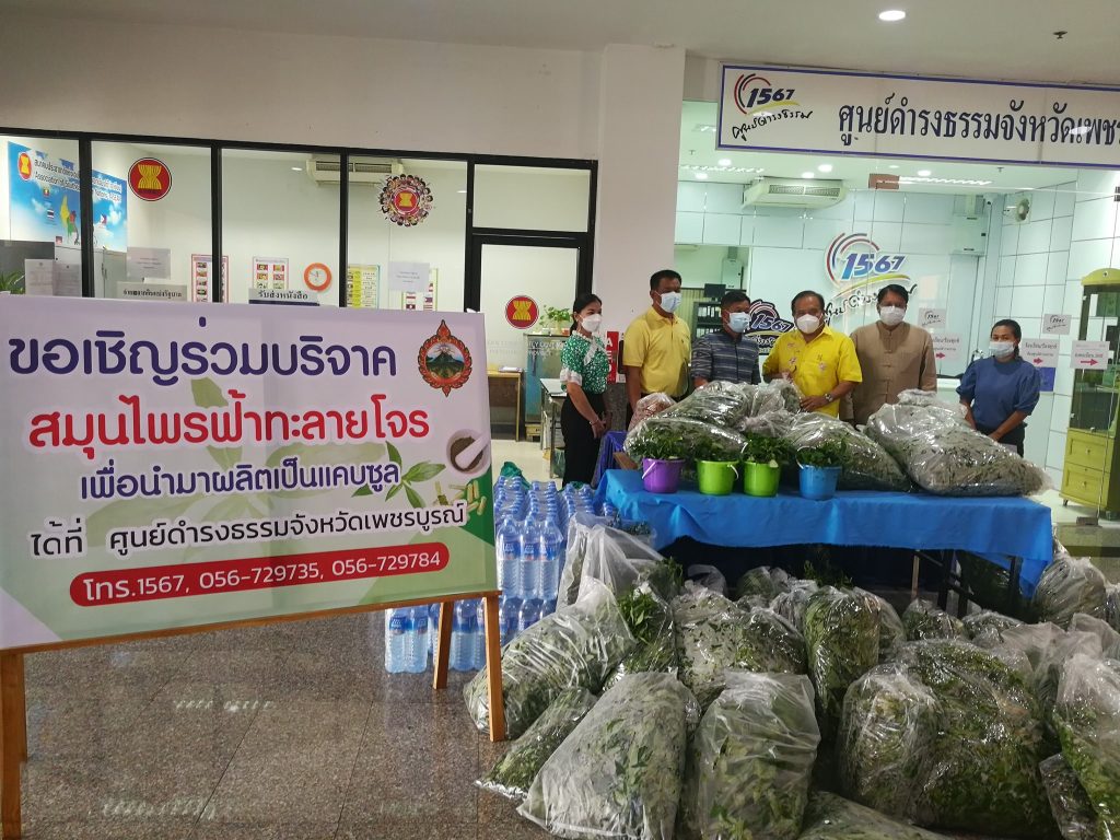 วันศุกร์ที่ 30 กรกฎาคม พ.ศ. 2564 นายอนันต์ ตั่นฉ้วน เกษตรจังหวัดเพชรบูรณ์ พร้อมด้วยว่าที่ ร.ต. สมใจ ทองศิริ หัวหน้ากลุ่มส่งเสริมและพัฒนาการผลิต และนางณัฐนันท์ กันตุ่ม หัวหน้าฝ่ายบริหารทั่วไป มอบสมุนไพรฟ้าทะลายโจร เพื่อนำผลิตเป็นแคปซูลใช้ป้องกันและรักษาผู้ป่วยติดเชื้อไวรัสโคโรนา 2019 (COVID-19) โดยมีนายณรงศักดิ์ หอมมาลัย รองผู้ว่าราชการจังหวัดเพชรบูรณ์ และนายจิรวัตร์ มณีโชติ หัวหน้าสำนักงานจังหวัดเพชรบูรณ์ รับมอบต้นสมุนไพรฟ้าทะลายโจรจากสำนักงานเกษตรจังหวัดเพชรบูรณ์ ณ ศากลางจังหวัดเพชรบูรณ์ (อาคาร 1) จังหวัดเพชรบูรณ์